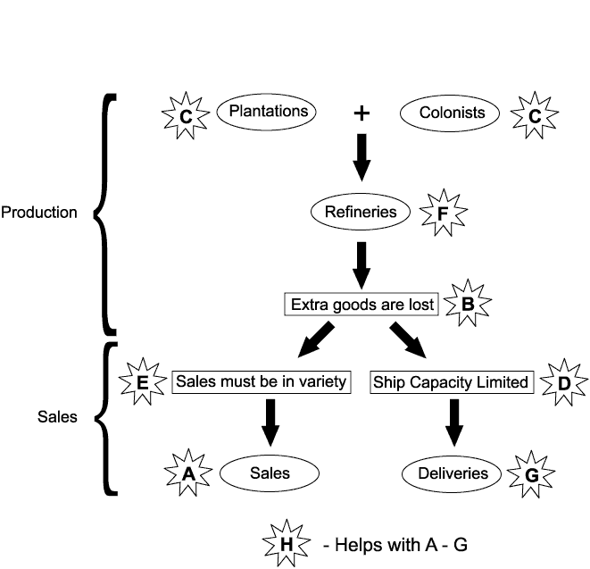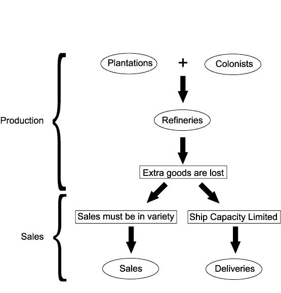 The basic flow is that Plantations and Colonists create production, which must be Refined. (Corn, which actually does not need to be refined, is treated here as having a very trivial refinement process.)