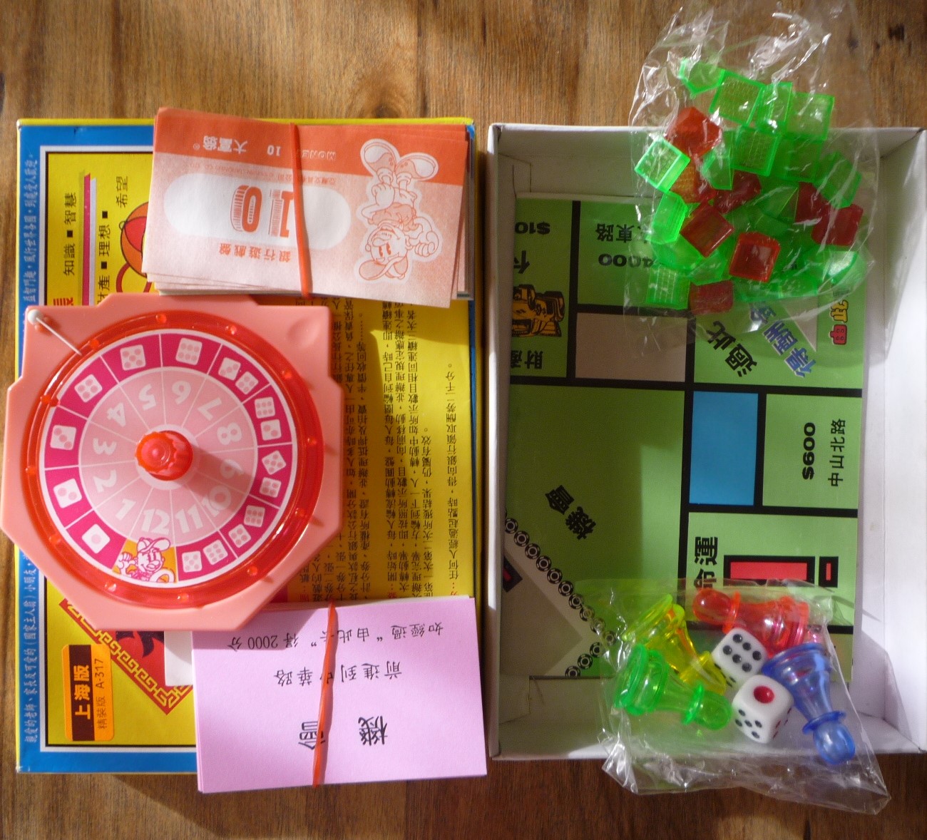 Billionaire is a quite similar Chinese-language game which renames all the spaces and modifies some rules, also including cartoon illustrations on the board. The dice are replaced by a plastic spinner giving numbers 1-12, thus changing the landing probabilities. Includes large, clear plastic pawns.