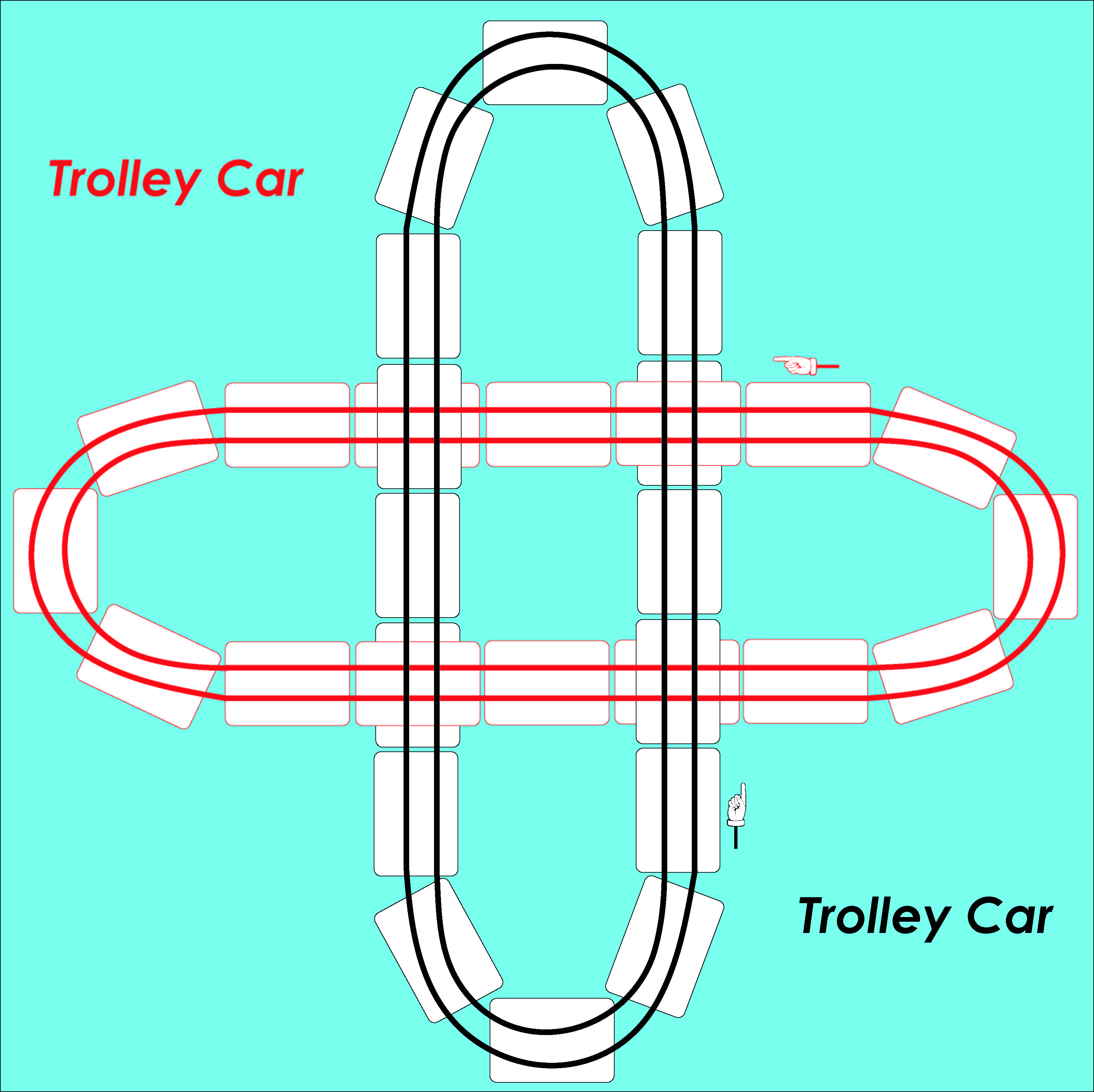 Players will notice that the trolley car lines intersect at four locations. At these locations, the first trolley car which reaches the intersection controls it. This means that the other line does not place a trolley card at the intersection and in addition, the rank, though not the color, of the car which was placed in the intersection becomes the rank for the line which reaches the intersection second.
